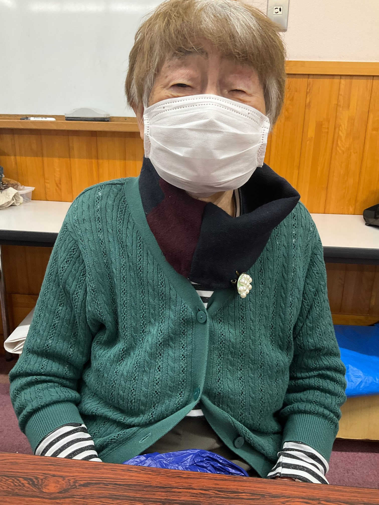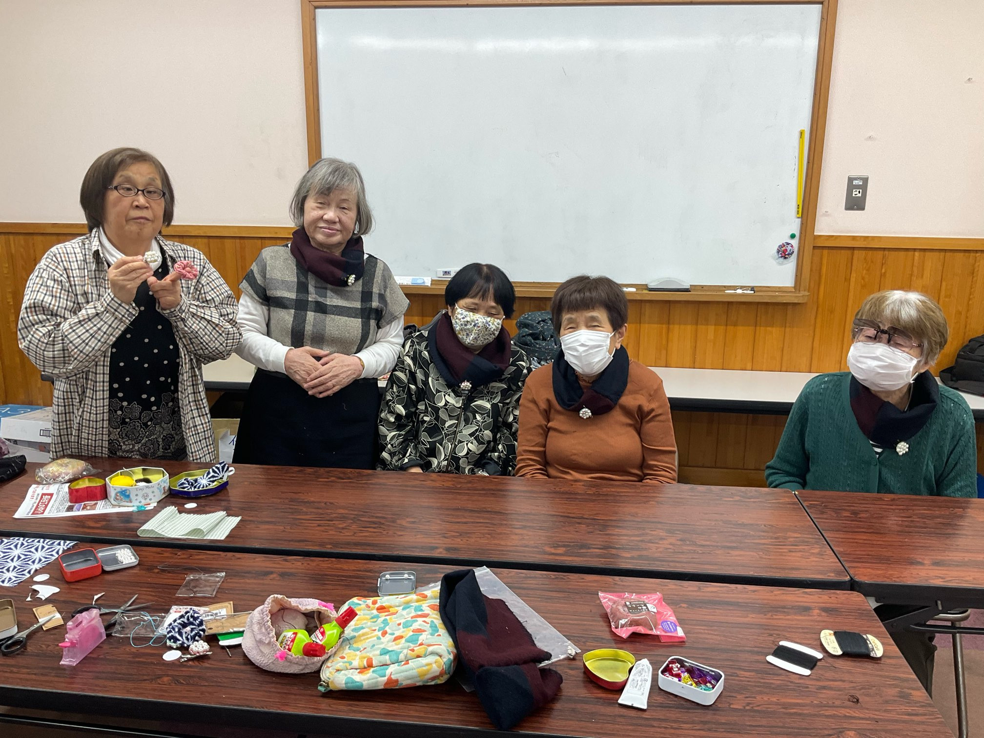 皆さん、私の持っていった大型ショールを切って分けて縫って、帰る時には皆さん首に巻いて写真撮影。