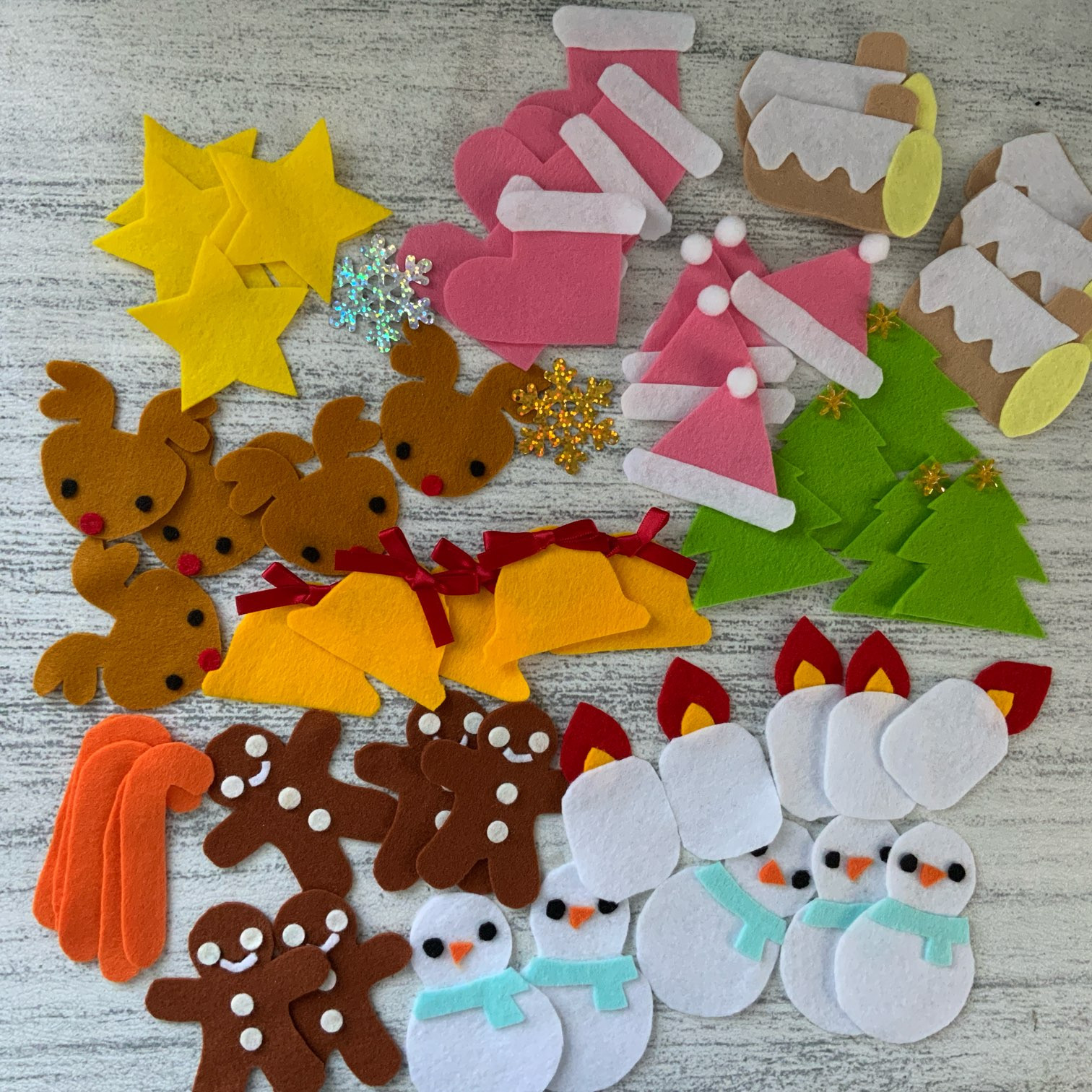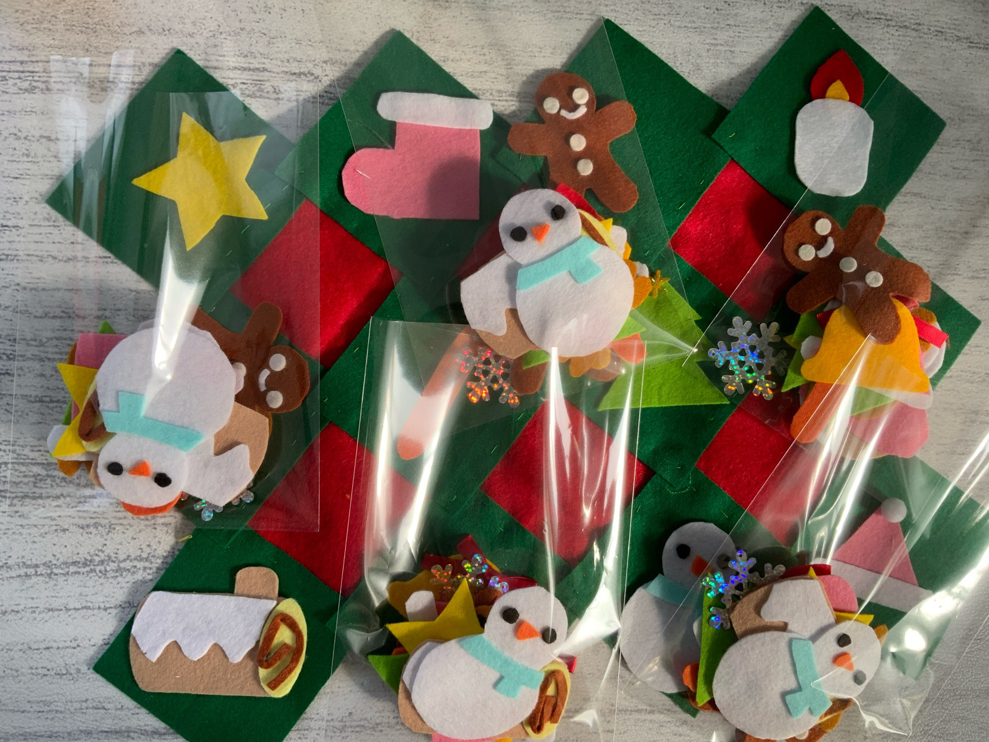 雪だるま、ジンジャーマン、キャンディーステック、ツリー、ベル、トナカイ、ロウソク、星、雪の結晶(これはスパンコール)、帽子、長靴、ノエルケーキ