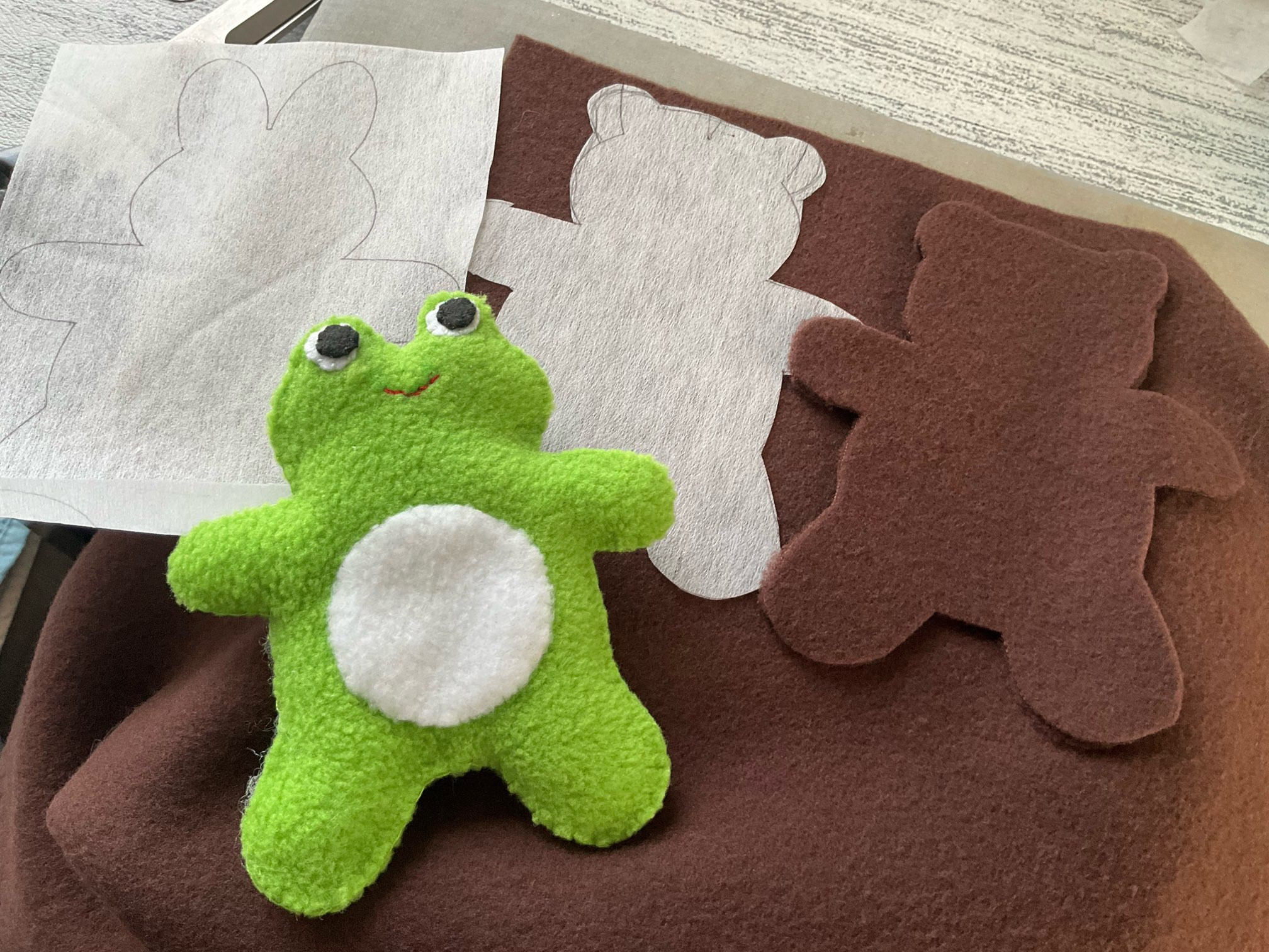 初めは厚紙の型紙をフリースに当てて、チャコマジックペンでなぞって切ったんですけど、フリースの色が濃いと印がつけづらいことに気がつく。