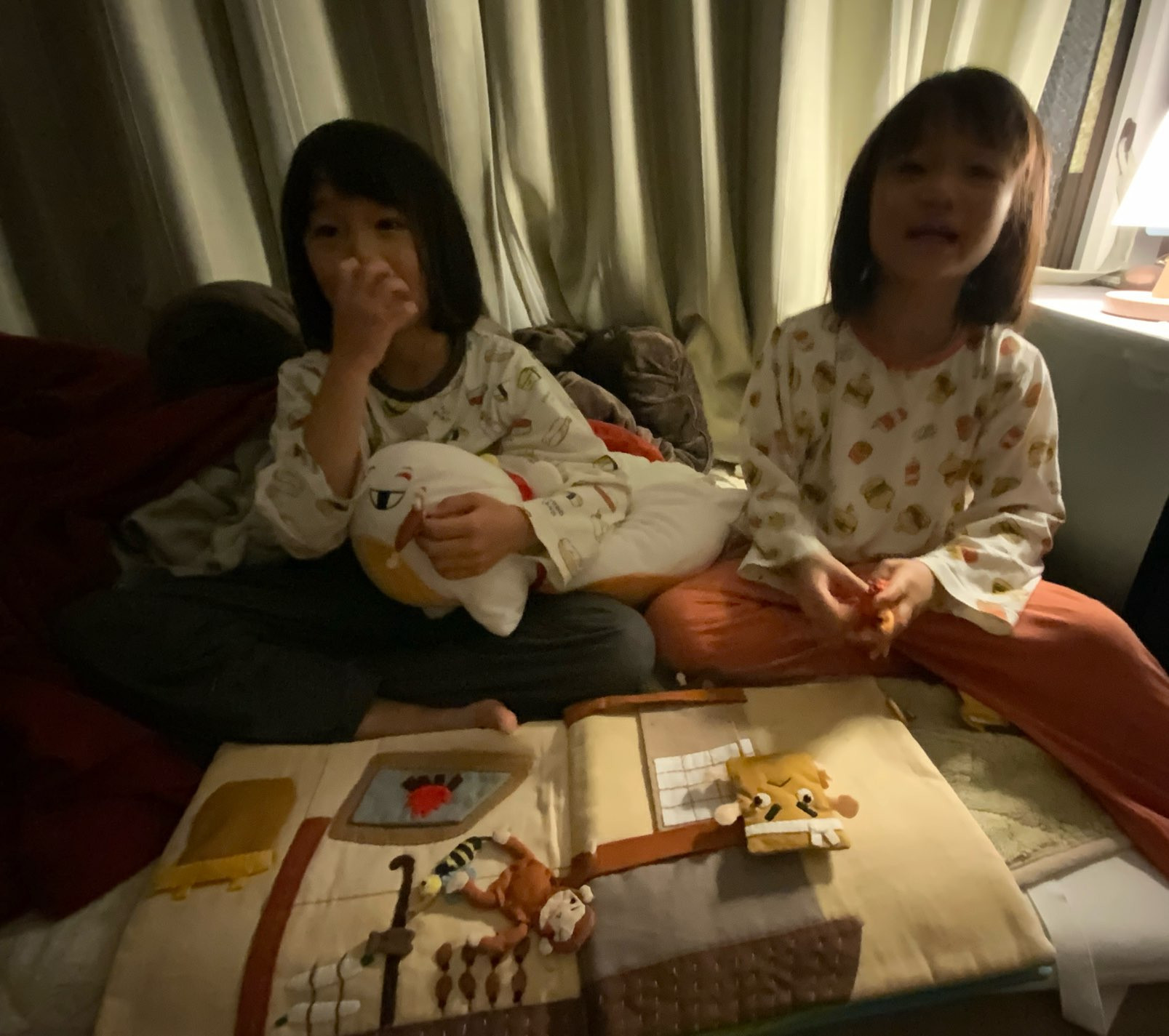 私の部屋で寝るというので布団の準備をして、寝る前に本を読んであげようと言うと、彼らは布絵本を持ってきました。