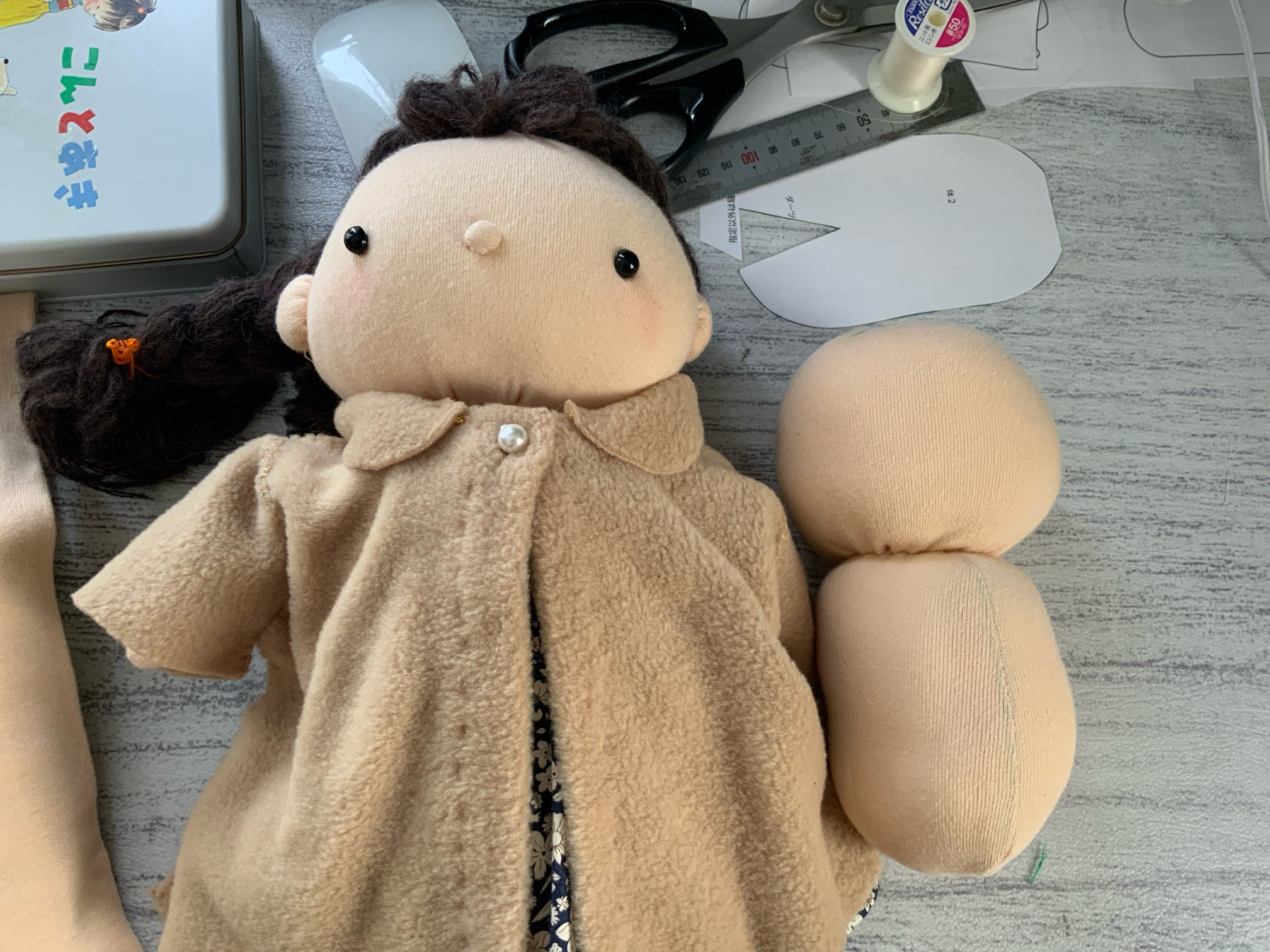 あまり大きくしないで欲しいというリクエストがあったので、前のひまわりちゃん人形の80%で、ちょっと型紙も変えて作りはじめてます。