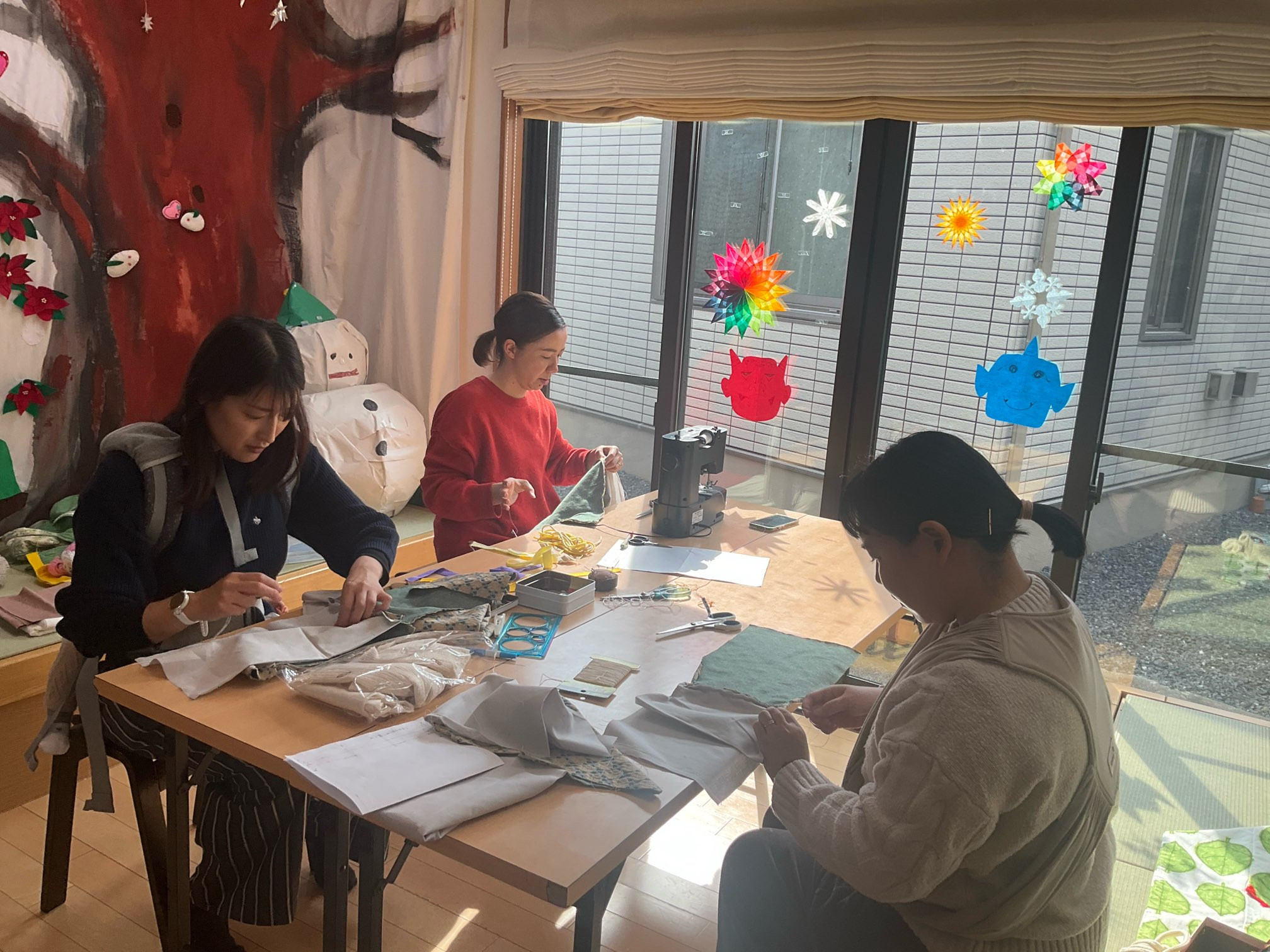 お一人の方が可愛い布を見つけてきて、その布をベースに上靴入れを3人のママが製作中。