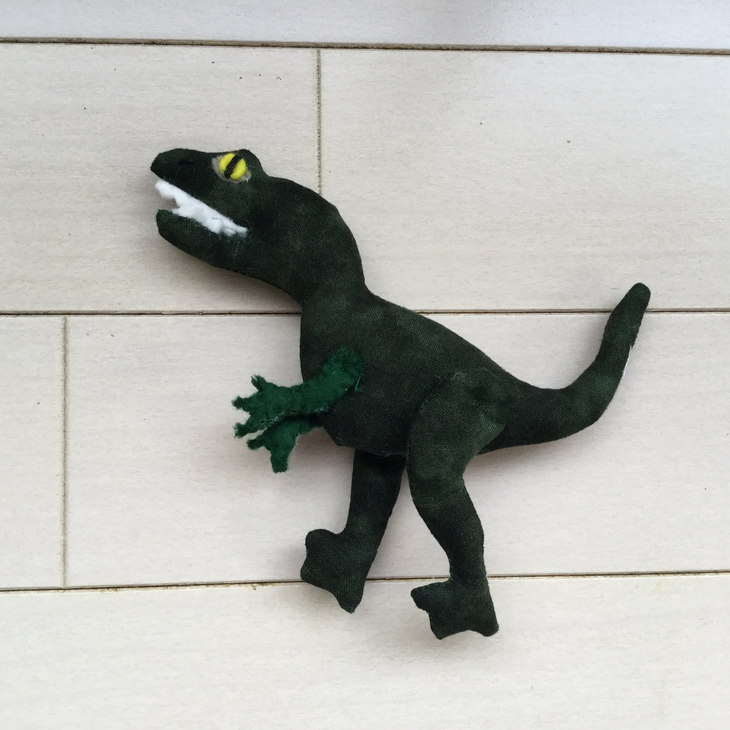 恐竜セットの注文が入ってキットを揃えていたら、あると思ってたアロサウルスの緑のムラ染めの生地がない!